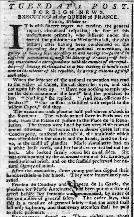 Annonce de l'execution de la Reine parue dans un journal anglais le 21 octobre 1793