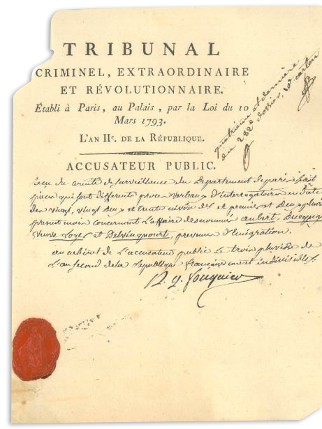 Le prétexte officiel fut l’avancée des armées de Condé… La mort de la Souveraine était fixée d’avance ; un faux procès, sans pièces et sans arguments (son avocat Chauveau Lagarde n’eut rien en mains pour la défendre), voilà ce que réservait l’Incorruptible à Marie Antoinette.