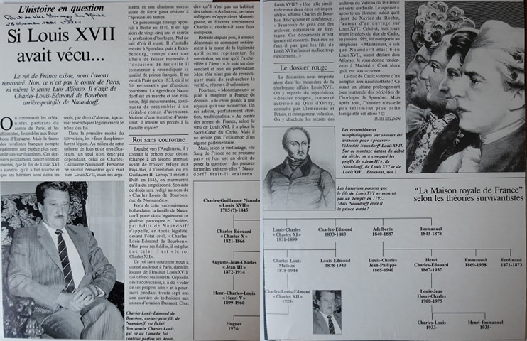 Pour mieux comprendre qu’il s’agit d’une trahison, faisons un saut de 29 années en arrière ! Nous sommes en novembre 1991. Et que voyons-nous dans le numéro 2261 du 28 novembre 1991 de la revue « Point de Vue et Images du Monde » ? Un article de Philippe Delorme, écrit sous le pseudonyme de Hari SELDON, vantant et confortant la survivance de Louis XVII et faisant mille courbettes à S.A.R. Charles-Louis-Edmond de Bourbon, arrière petit-fils de Louis XVII/« Naundorff »…
