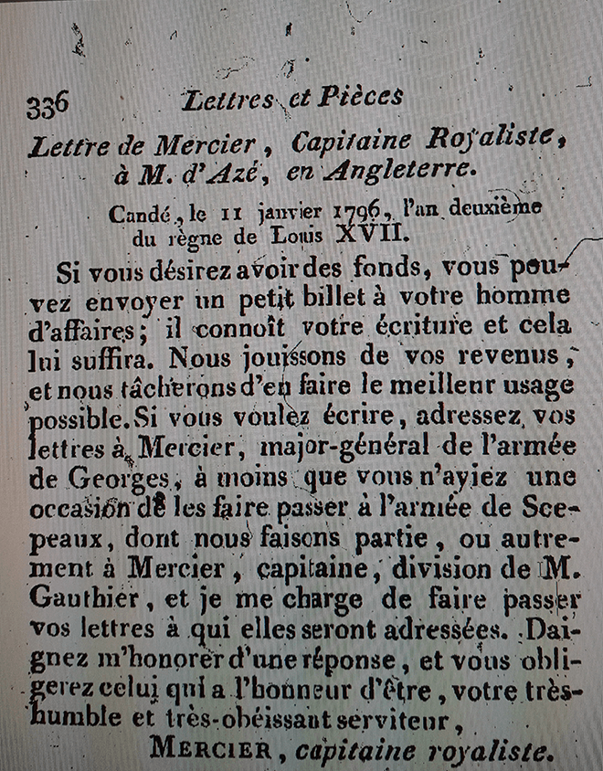 Voici la lettre écrite par un certain Mercier, capitaine dans l’armée royalise de Vendée, datée du 11 janvier 1796 DE L’AN DEUXIEME DU RÈGNE DE LOUIS XVII… (Correspondance secrète de Charrette, Stofflet, Puisaye et autres Tome II– A Paris – Chez F. Buisson – Imprimerie Libre - rue Haute-Feuille n°20 – An VII de la République Française).